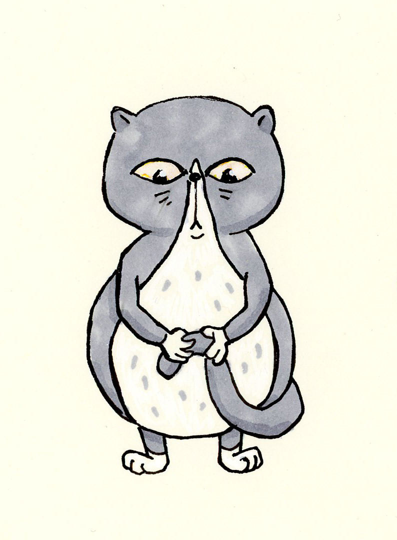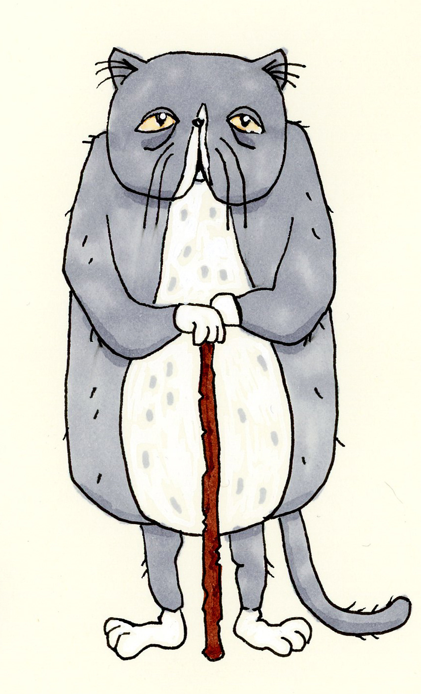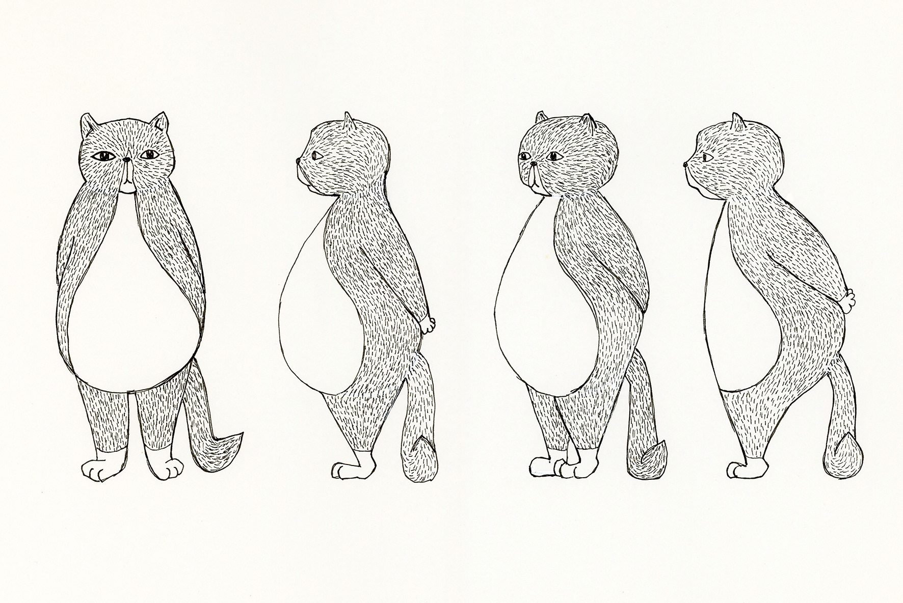 Turnaround av karaktär. Karaktären som gammal och som liten. Fineliner, markers. 2021.